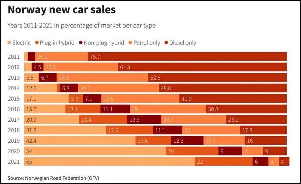 当地预计今年电动新车渗透率能跨步到80%,增速非常快。从2011年的1%到2021年的65%,挪威就用了十年,距离100%似乎只剩时间问题。挪威原本目标在2025年成为世界上第一个停止销售燃油车的国家,现在来看将提前实现。