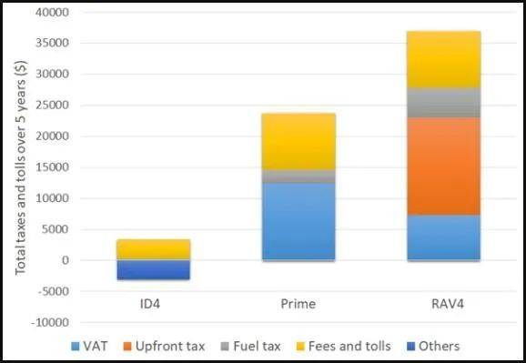 此外,电动车还享受免征过路费,允许使用公交车专用道,半价甚至免费停车等等优惠。具体可以参见energypost.eu对挪威在售的大众ID.4、丰田RAV4 Prime(插混版)和RAV4的成本对比: