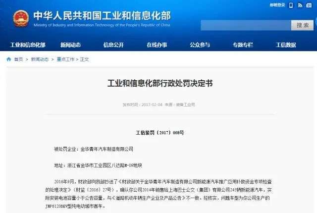 为了促进新能源行业的良性发展,避免劣币驱逐良币。在2016年12月20日,工信部网站发文“严惩新能源汽车骗补行为规范产业发展秩序”,同时下发了四份行政处罚决定书,对9月8日财政部通报的苏州金龙、河南少林客车、奇瑞万达贵州客车、深圳市五洲龙等四个骗补典型案例给予行政处罚。
