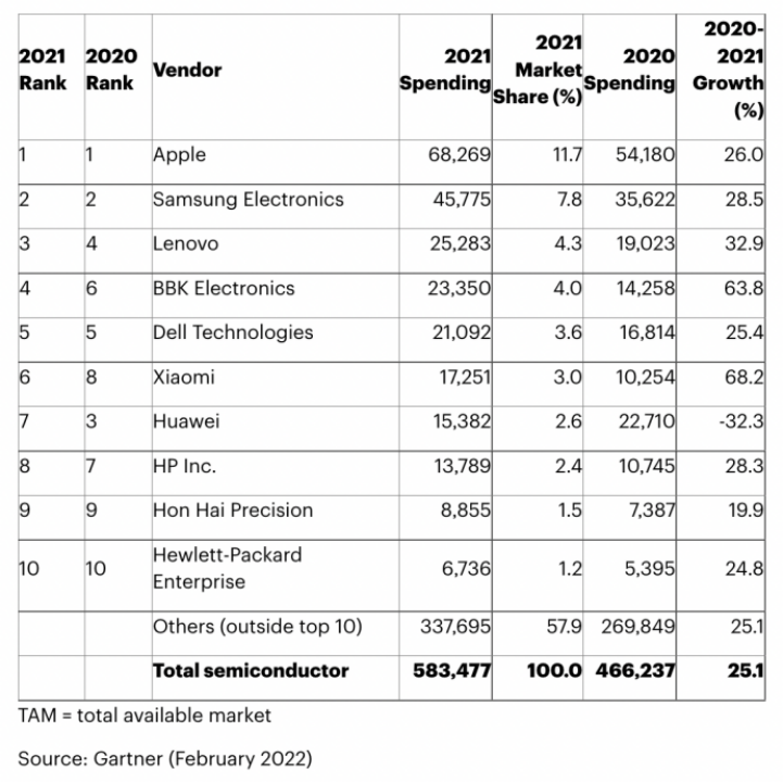 Gartner发布的2021年全球芯片购买量Top 10报告显示,2021年苹果以超过682亿美元的芯片采购量成为采购最多半导体的公司,三星以超457亿美元采购量位居第二。自 2011 年以来,苹果和三星电子一直保持着前两名的位置。