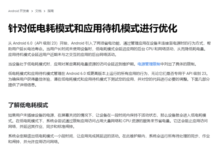 Doze模式,其实就是一个优化后台和延长手机使用时间的模式,当用户一段时间没有使用手机的时候,Doze模式通过延缓app后台的CPU和网络活动减少电量的消耗,并且在一定程度上能够保证手机的流畅性。