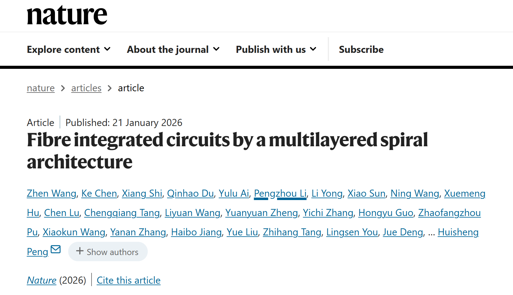 1月22日,记者从复旦大学获悉,一项可能改变未来穿衣体验的技术突破问世。该校彭慧胜/陈培宁团队成功制造出一种新型纤维,它不仅能弯曲、拉伸,更关键的是内部含有高密度的微型电路,具备良好的信息处理能力。该成果于1月22日凌晨以《基于多层旋叠架构的纤维集成电路》为题发表于《自然》主刊上,意味着未来我们的衣服本身可能就会“思考”和“计算”。
