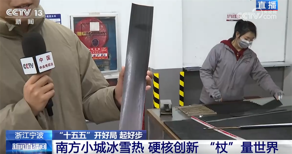 在浙江宁波宁海县的一处生产车间,从这里走出去的运动器材简单来说有这几个特征:雪场常客、强力支撑、保持平衡。猜到是什么了吗?别着急,给大家看一个道具,来帮大家猜这个谜底。现在记者手中拿着的是一块布,镜头推近,您会发现它是一块碳纤维布料。首先进行烫布,保证平整;第二步,卷管机自动卷管,快速缠带,一气呵成;再经过烘烤、研磨、安装配件后,就变成了一根滑雪杖。对,谜底就是“滑雪杖”。从一块布变成一根杖,平均只需要15秒。这不是魔术,而是滑雪杖里的“中国速度”。
