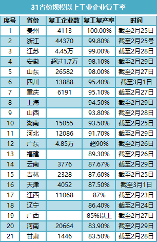 据梳理,21省份规模以上工业企业复工率超80%,贵州100%复工。此外,复工率达90%的省份有11个。