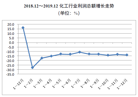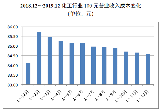 总体看,全行业效益下滑趋缓。1~12月,石油和化工行业实现利润总额6683.7亿元,同比下降14.9%,降幅比1~11月收窄2.7个百分点,占同期全国规模工业利润总额的10.8%。每100元营业收入成本82.67元,同比上升1.39元;资产总计13.40万亿元,增长7.7%,资产负债率55.92%,同比上升1.16个百分点;亏损企业亏损额1320.8亿元,同比扩大9.7%;行业亏损面为17.6%,较前11月缩小1.4个百分点。2019年,全行业营业收入利润率为5.45%,同比下降1.04个百分点点;毛利率为17.33%,回落1.39个百分点。产成品存货周转天数为15.7天;应收票据及账款平均回收期为36.0天。
