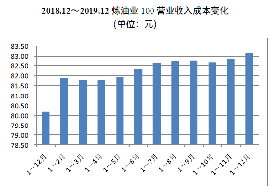 三是单位成本保持高位运行。1~12月,全行业营业成本增幅3.1%,高出营业收入增幅1.8个百分点;每100元营业收入成本虽较前11月上升0.12元,同比则上升1.39元。其中,化工行业每100元营业收入成本同比上升0.69元,炼油业则上升了2.91元。成本持续高位运行,严重制约行业经济效益的回升。