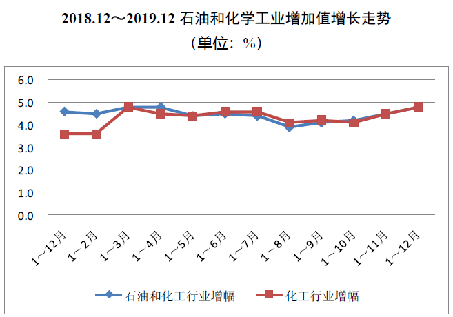 据国家统计局数据,截至12月末,石油和化工行业规模以上企业26271家,较上月末增加68家,全年增加值增长4.8%,增速较上年加快0.2个百分点,但仍低于同期全国规模工业增加值增幅0.9个百分点。其中,化学工业增加值增长4.8%,较上年加快1.2个百分点;石油天然气开采业增长6.0%,加快1.0个百分点;炼油业增幅4.3%,减缓2.1个百分点。