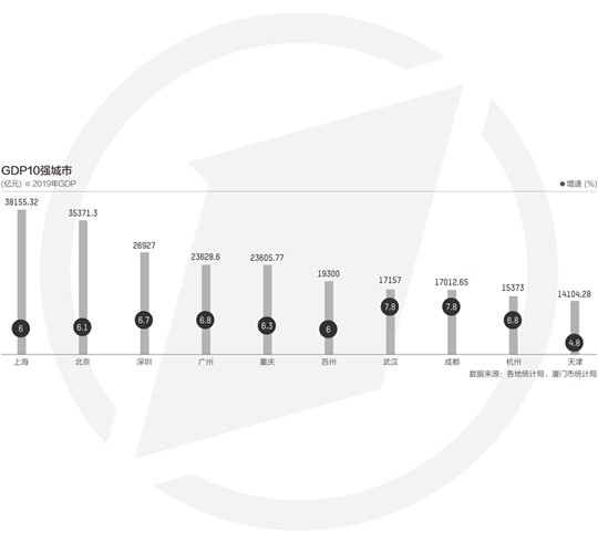 截至目前,2019年GDP十强城市数据均已揭晓,排名前十的城市分别是上海、北京、深圳、广州、重庆、苏州、武汉、成都、杭州和天津。