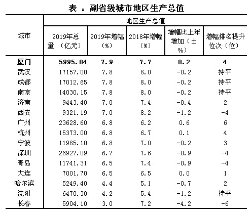 根据厦门市统计局官网日前发布的《2019年厦门与副省级城市比较分析》(下称“分析报告”),2019年,15个副省级城市中,GDP超过万亿元的为8个。