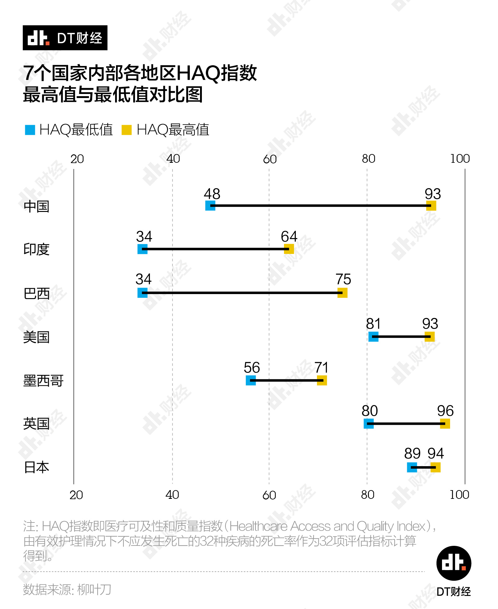 而其中,内部医疗能力发展最不均衡的国家就包括中国和印度。《柳叶刀》给出了包括日本、英国、美国和中国、墨西哥、巴西、印度在内7个国家内部省级行政区域之间的医疗质量差值。