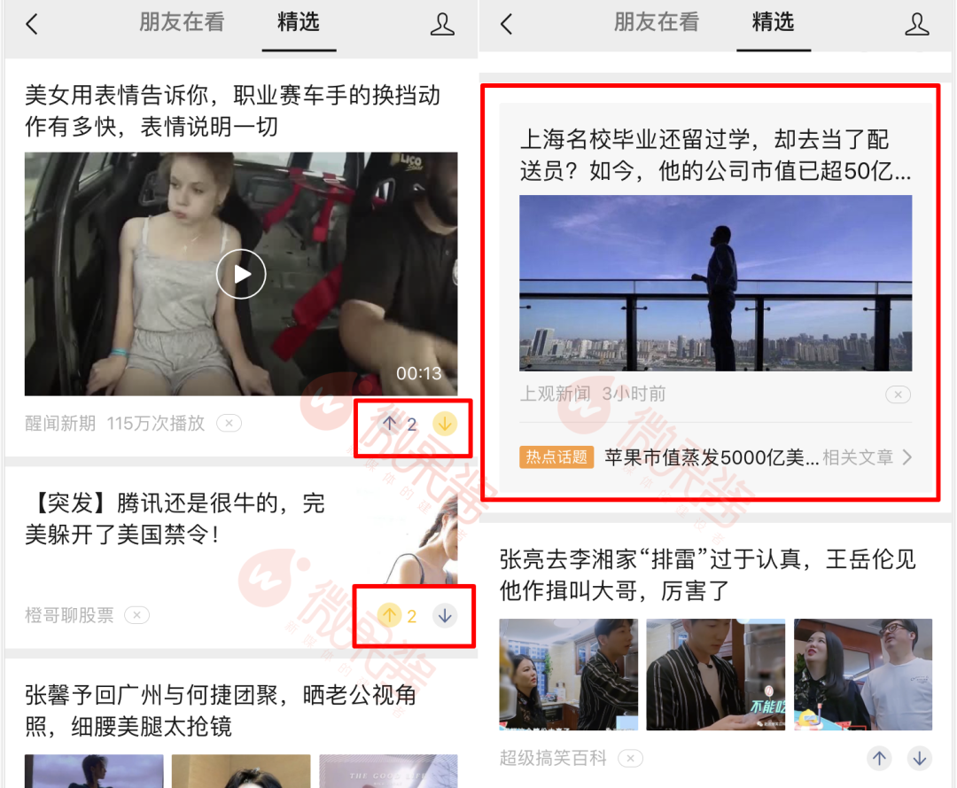 据微果酱报道,“看一看+”精选在改版之后,新增“点赞”和“点踩”功能。点赞数为明文显示,但点踩数则不会显示。目前为止,该功能只有部分iOS内测用户才能看到。