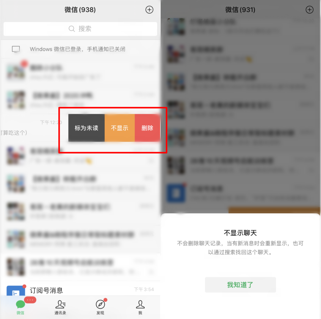 在新的微信内测版中,可以只隐藏聊天记录,当有新消息时则重新显示。在历经多年之后,这一QQ时代就有的功能,终于在微信上出现。