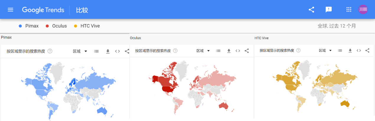 据统计,小派科技的产品已销往全球72个国家和地区。通过Google Trends的数据比较,可以发现小派科技在全球的品牌影响范围和搜索热度与VR行业巨头Oculus、HTC Vive基本一致。