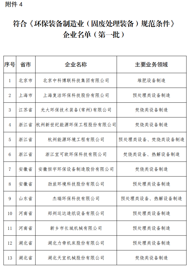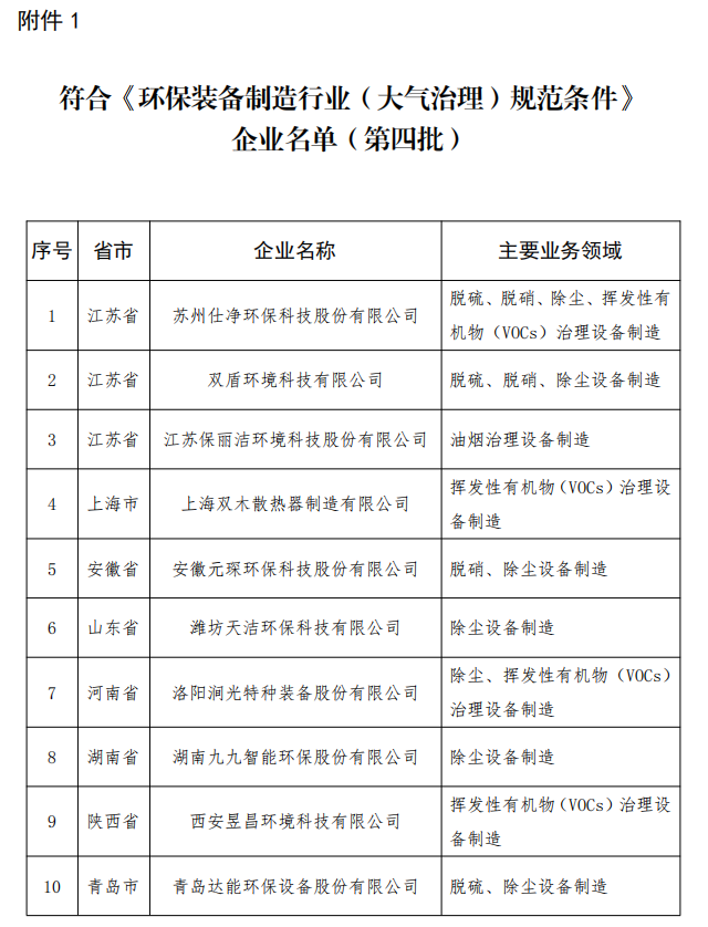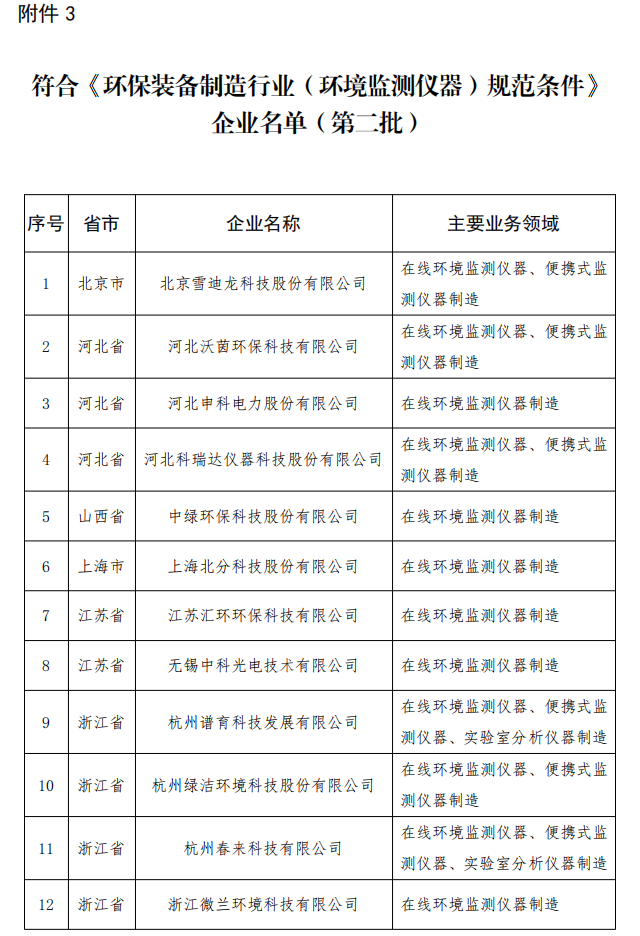 按照《环保装备制造行业(大气治理)规范条件》《环保装备制造行业(污水治理)规范条件》《环保装备制造行业(环境监测仪器)规范条件》《环保装备制造业(固废处理装备)规范条件》有关要求,经企业自愿申报、地方工业主管部门审核推荐、专家评审及现场核实、网上公示等程序,现将符合上述规范条件的企业名单予以公告。
