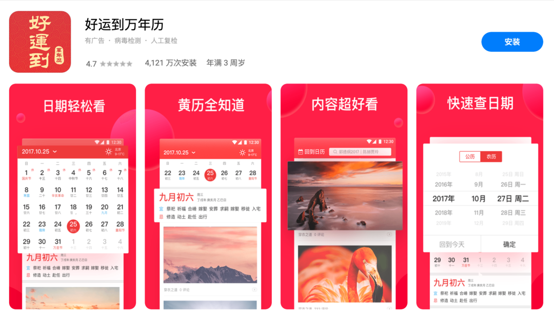 目前,“好运到万年历”App已在各大安卓应用市场上线,但是在Apple Store中暂未上线。