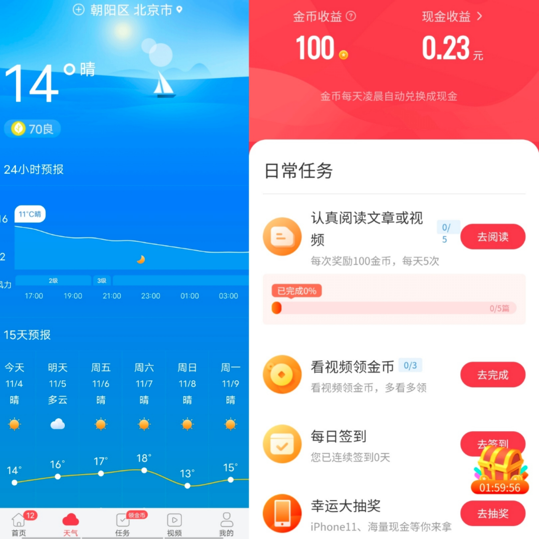 除了以上常规的功能外,该App最吸引人的功能当属任务功能,这也是近期该App增加的一个新功能,用户可以通过做日常任务,比如阅读文章或视频即可获取金币(App内的虚拟货币),积累的金币会在每日凌晨按照一定的比例兑换成现金,现金积累到一定金额后即可提现到个人的支付宝,目前最低的提现金额为0.5元。这样的做法大大提升了用户在App内的停留时长。