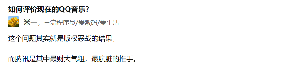 一位知乎用户这样表述:「这个问题其实就是版权恶战的结果,而腾讯是其中最财大气粗,最肮脏的推手。」