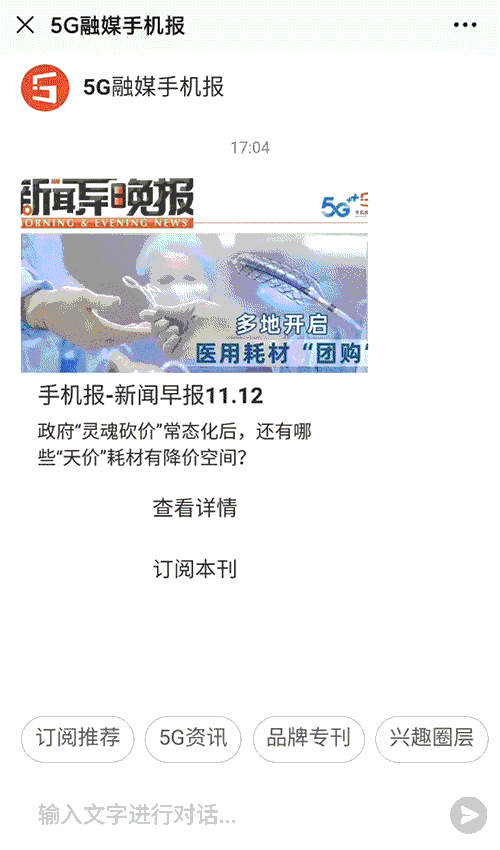 另外,从已有的演示案例来看,5G消息小程序在人机交互以及对媒体信息的支持上已经做得非常到位。从这份手机报来看,它采用了H5交互界面,植入了文字、图片、视频等元素,综合效果远超传统模式的手机报刊。