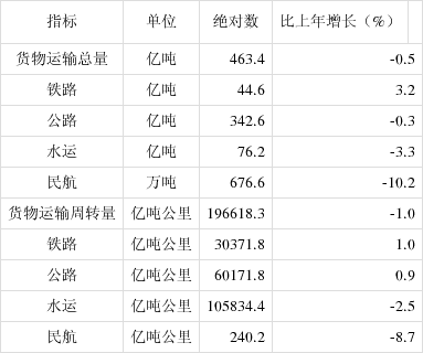 全年货物运输总量[24]463亿吨,货物运输周转量196618亿吨公里。全年港口完成货物吞吐量145亿吨,比上年增长4.3%,其中外贸货物吞吐量45亿吨,增长4.0%。港口集装箱吞吐量26430万标准箱,增长1.2%。