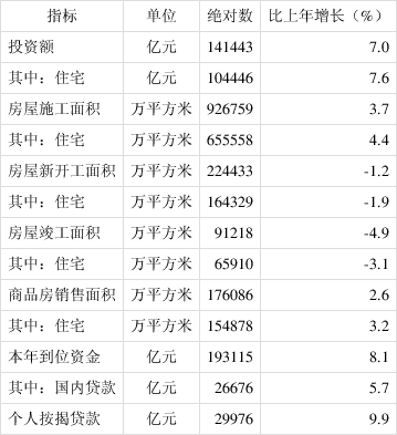 全年房地产开发投资141443亿元,比上年增长7.0%。其中住宅投资104446亿元,增长7.6%;办公楼投资6494亿元,增长5.4%;商业营业用房投资13076亿元,下降1.1%。年末商品房待售面积49850万平方米,比上年末增加29万平方米。其中,商品住宅待售面积22379万平方米,减少94万平方米。