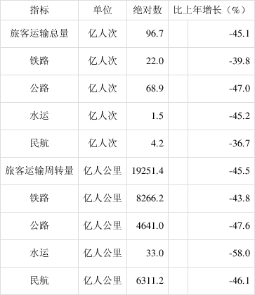 全年旅客运输总量97亿人次,比上年下降45.1%。旅客运输周转量19251亿人公里,下降45.5%。