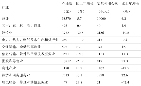 全年外商直接投资(不含银行、证券、保险领域)新设立企业38570家,比上年下降5.7%。实际使用外商直接投资金额10000亿元,增长6.2%,折1444亿美元,增长4.5%。其中“一带一路”沿线国家对华直接投资(含通过部分自由港对华投资)新设立企业4294家,下降23.2%;对华直接投资金额574亿元,下降0.3%,折83亿美元,下降1.8%。全年高技术产业实际使用外资2963亿元,增长11.4%,折428亿美元,增长9.5%。