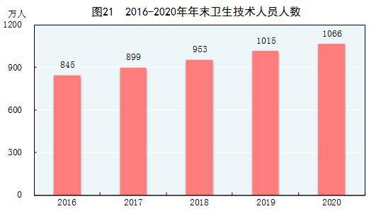 年末全国共有医疗卫生机构102.3万个,其中医院3.5万个,在医院中有公立医院1.2万个,民营医院2.4万个;基层医疗卫生机构97.1万个,其中乡镇卫生院3.6万个,社区卫生服务中心(站)3.5万个,门诊部(所)29.0万个,村卫生室61.0万个;专业公共卫生机构1.4万个,其中疾病预防控制中心3384个,卫生监督所(中心)2736个。年末卫生技术人员1066万人,其中执业医师和执业助理医师408万人,注册护士471万人。医疗卫生机构床位911万张,其中医院713万张,乡镇卫生院139万张。全年总诊疗人次[62]78.2亿人次,出院人数[63]2.3亿人。截至年末,全国累计报告新型冠状病毒肺炎确诊病例87071例,累计治愈出院病例82067例,累计死亡4634人。全国共有8177家医疗卫生机构提供新型冠状病毒核酸检测服务,总检测能力达到1153万份/天。
