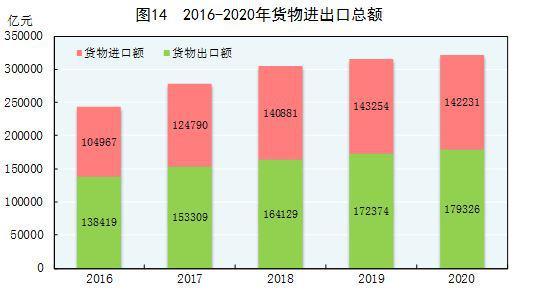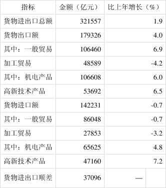 全年货物进出口总额321557亿元,比上年增长1.9%。其中,出口179326亿元,增长4.0%;进口142231亿元,下降0.7%。货物进出口顺差37096亿元,比上年增加7976亿元。对“一带一路”[38]沿线国家进出口总额93696亿元,比上年增长1.0%。其中,出口54263亿元,增长3.2%;进口39433亿元,下降1.8%。