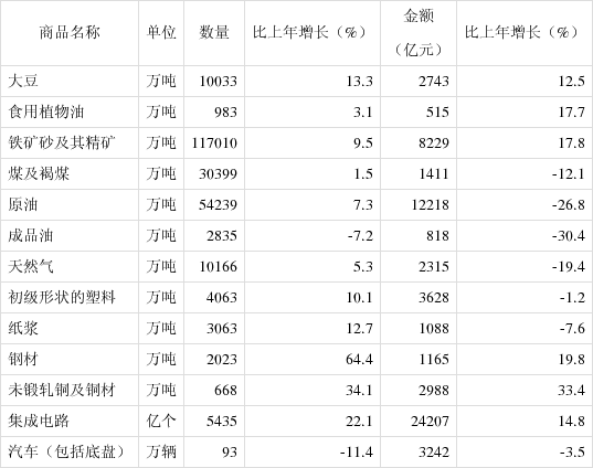 表102020年主要商品进口数量、金额及其增长速度