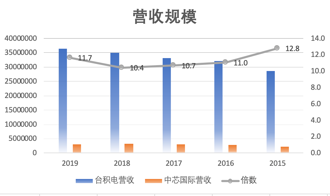 《商业数据派》在中芯国际和台积电近5年的详细业绩方面做了详细的对比,从营收规模上看(详见下图),台积电的营收一直都在中芯国际的10倍以上,而其晶圆出货量的倍数才仅仅2~3倍左右,也就是说中芯国际每个晶圆的价格比台积电便宜,可见中芯国际的议价能力远远低于台积电。