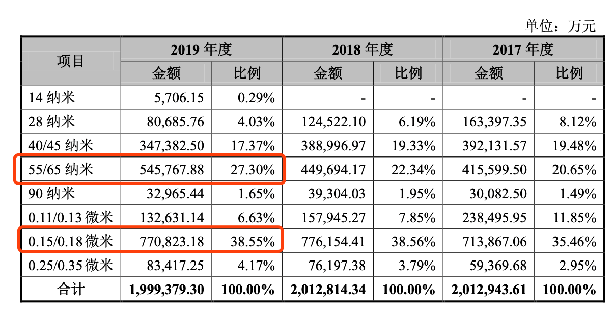 近三年内,中芯国际 28 纳米制程产品收入分为 16.3亿元、12.4亿元及 8.1亿元,占比分别为 8.12%、6.19%及 4.03%,收入及占比持续下降; 于 2019 年第四季度开始量产14 纳米制程产品,相关收入为 5706.15 万元,占比为 0.29%。