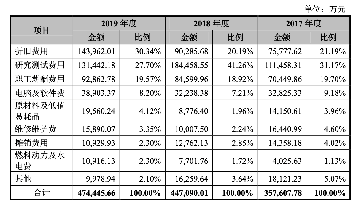 其次是研究测试费用主要为试片费,2019 年度为13.1亿元,占研发费用的27.70%,研发效率有所提升。