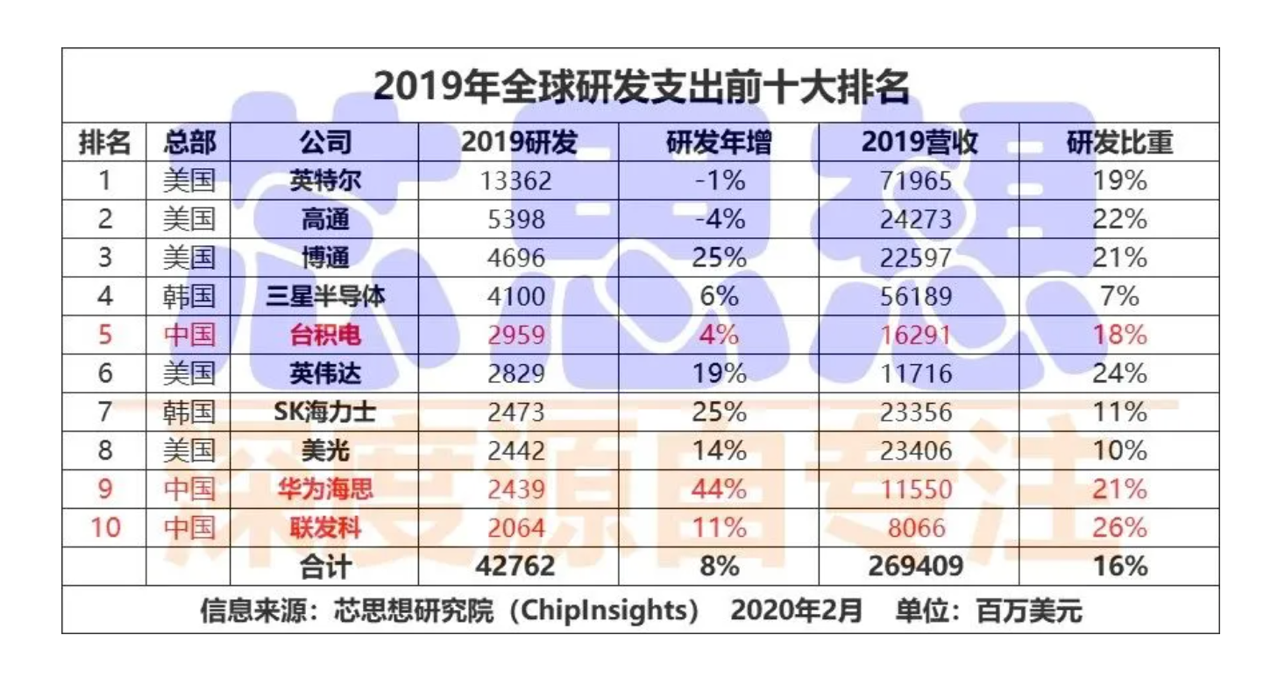 既然是强技术驱动的商业,那么必然在研发投入上少不了。下图是2019年全球芯片企业对于研发投入上的量级和占比。