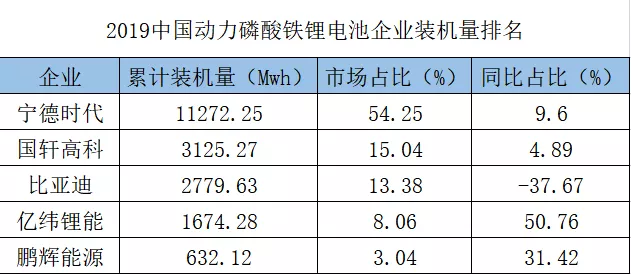 2019中国动力磷酸铁锂电池企业装机量排名