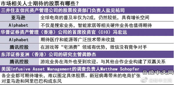 中美IT企业在股市上的评价变高是因为什么?香港的华晋证券资产管理公司首席投资官冯宏远认为,就算疫情结束,新的生活方式或许也不会改变,这一点成为这些企业的东风。例如,亚马逊的2020年1~3月销售额同比增长26%,达到754.52亿美元,创出该季度的历史纪录。由于疫情的外出限制措施,电商的利用正在扩大。