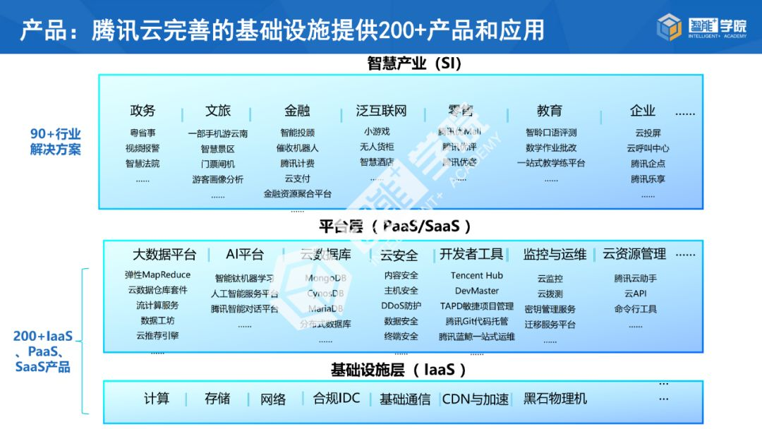 分领域看,不同玩家在边缘层、平台层、应用层也各有布局。其中,阿里巴巴、腾讯、华为等科技巨头试图对平台层和应用层实现全面渗透。以腾讯为例,其提供计算、存储等基础设施层服务,也提供大数据平台、AI平台、云数据库等平台层服务,同时还输出行业解决方案。