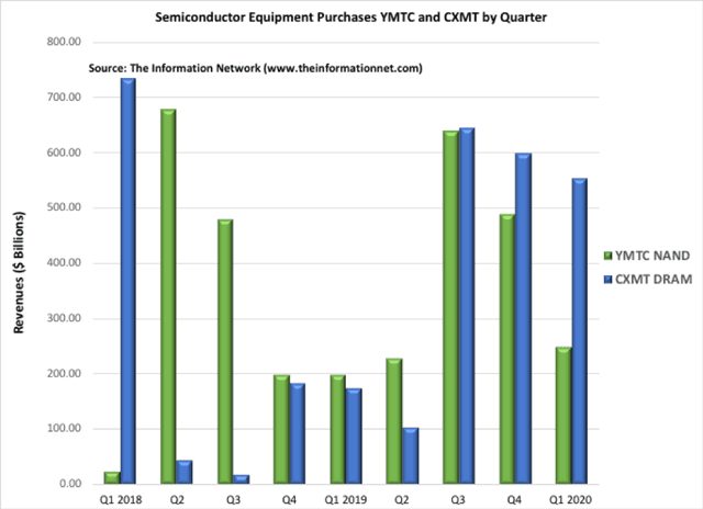 在这样的情况下,过去九个季度里中国的两家制造存储芯片公司,生产3D NAND的长江存储技术(YMIC)和生产DRAM的长鑫存储技术有限公司(CXMT)分别购买了30亿美元的生产设备。