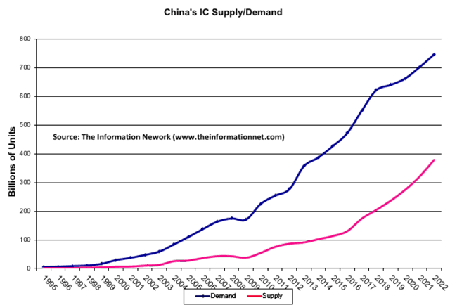 目前,中国OEM厂商生产电子设备所需的半导体设备需求与中国内部制造供应之间在存在着较大的缺口,尽管中国自主制造的芯片数量逐年上涨,但需求量也逐年升高,预计到2022年供应量达到4千亿,需求量达到7.5亿,供需差距3.5亿片。