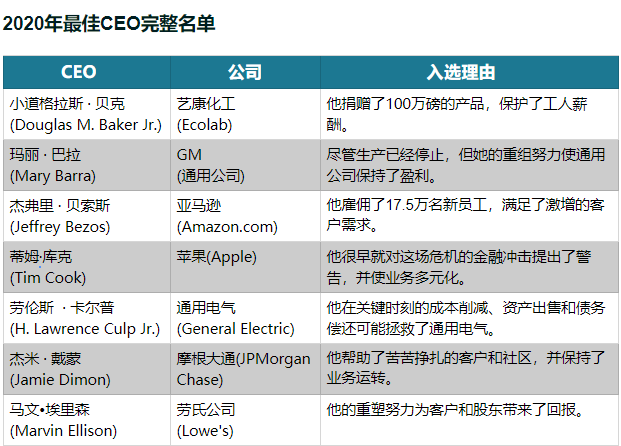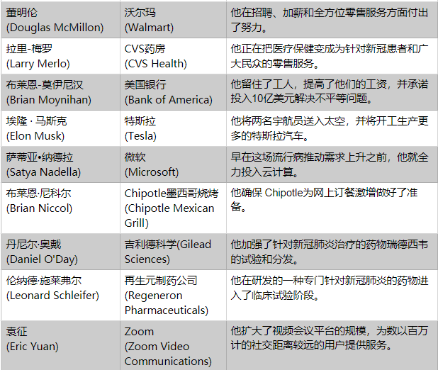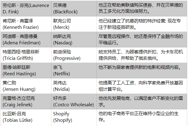 这次,我们把重点放在2020年的美国,更多地依赖于我们编辑部评审团的判断,并把一些问题纳入考虑:首席执行官们是否为公司应对不可知的困难做好了充分准备?为了保证工人的安全、用户的兴趣和投资者的信心,他们对这场流行病的反应有多快和多有技巧?在某些情况下,他们又是如何加入到对抗新冠肺炎的战斗中来的呢?今年的压力是证明了他们商业模式的韧性,还是暴露了他们的弱点?