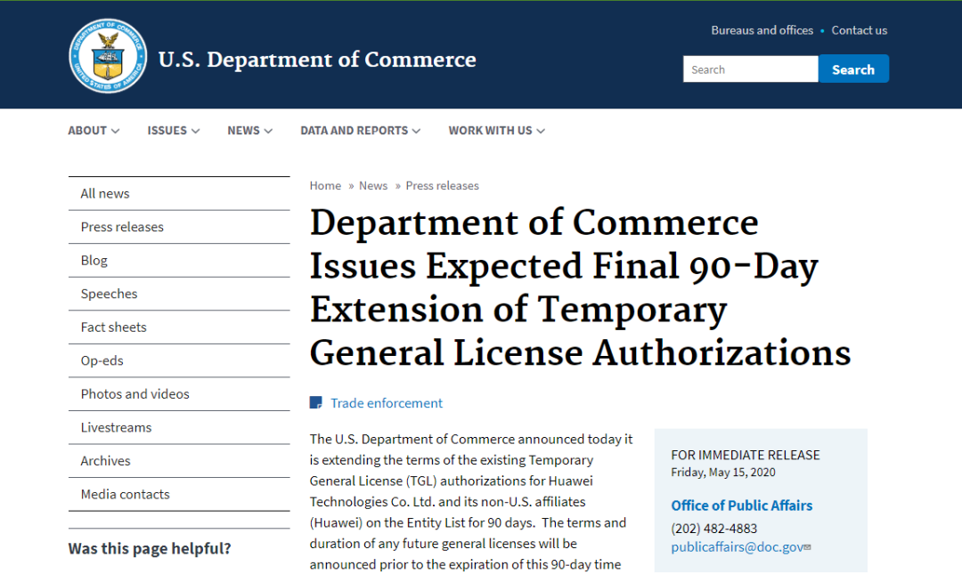 美国商务部在当地时间5月15日先后发布两条声明,第一条是美国将华为对美国企业销售通讯设备的临时许可再延长90天,即至8月13日,但其亦暗示,这可能是最后一次延长许可。