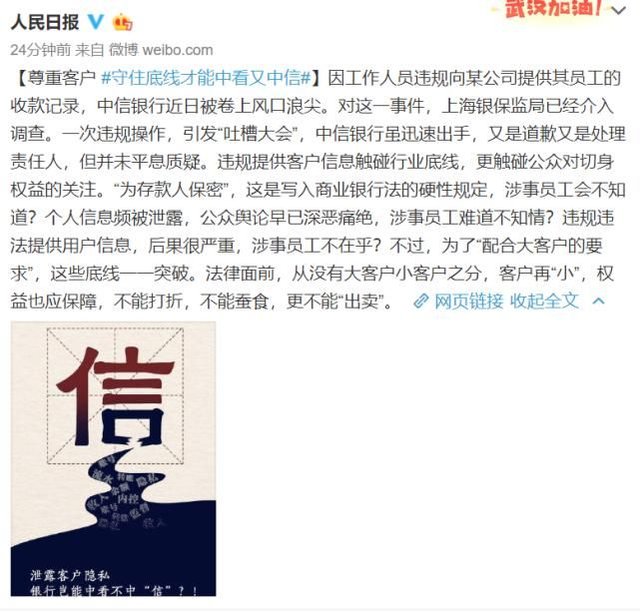 中信银行称,是个别员工未严格按照制度操作,但是据池子方面消息,中信银行回应是“配合大客户的要求”。这两个答案,有本质上的区别。前者是无心之失,没有主观意图;后者是明知故犯,是为了讨好所谓的“大客户”,不惜出卖自己的职业操守。