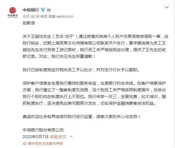 不过,在汹涌的个人信息安全的争议中,中信银行在5月7日夜间0点56分通过官微向池子道歉,并表示“近期上海笑果文化传媒有限公司联系开户支行,要求查询其为员工王越池先生支付劳务工资记录时,我行员工未严格按规定办理,提供了王先生的收款记录。”目前该行已按制度规定对相关员工予以处分,并对支行行长予以撤职。